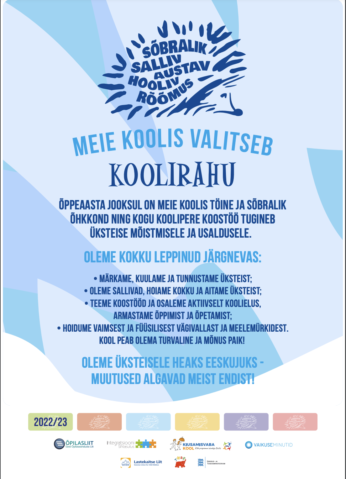 - mitte kedagi ei kiusataks – nii vaimselt kui füüsiliselt, nii igapäevaelus kui veebikeskkondades, nii kooli ajal kui väljaspool kooli!